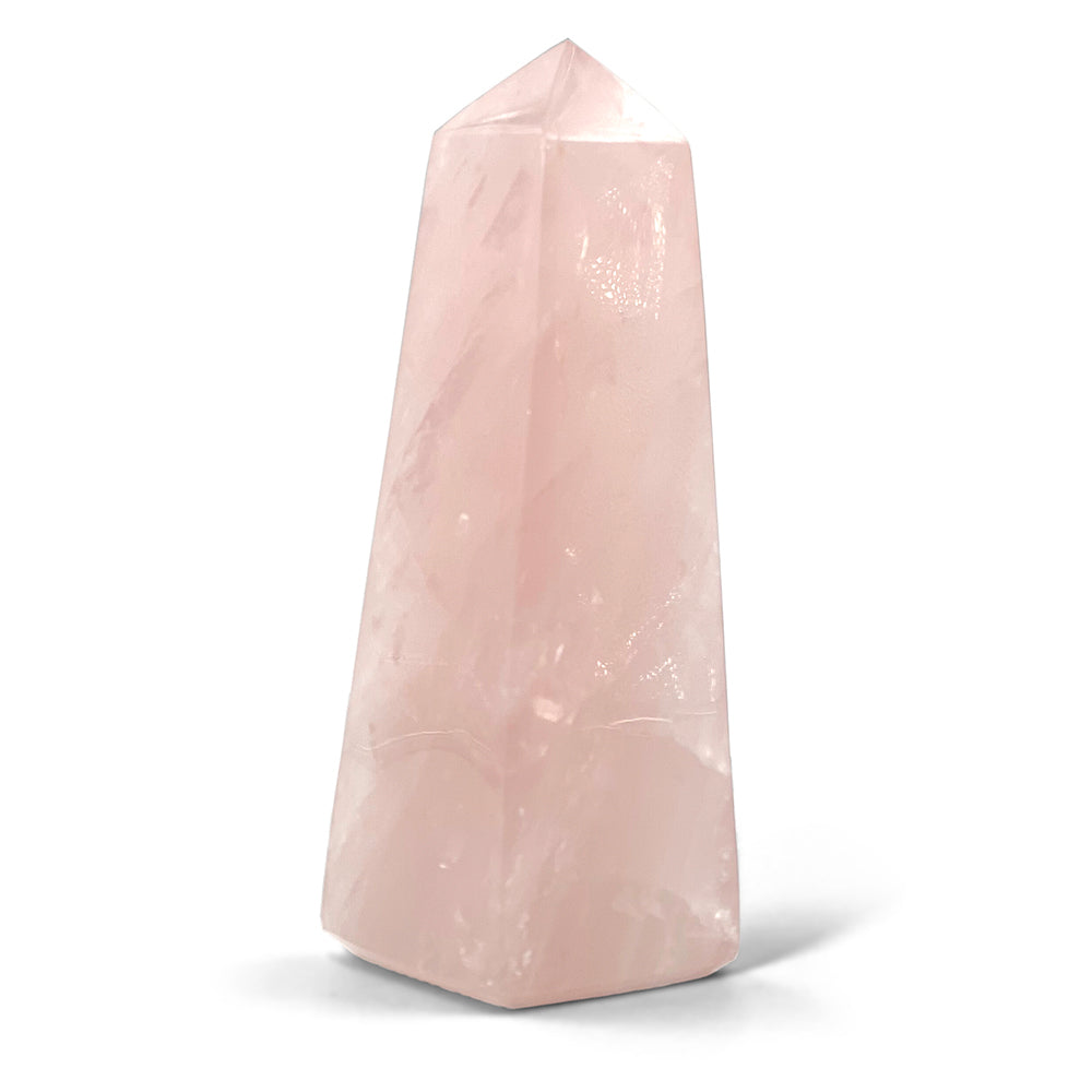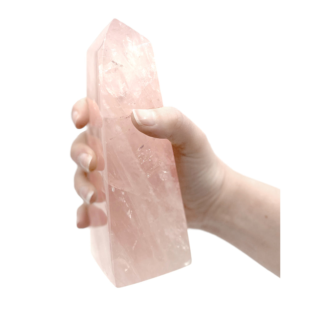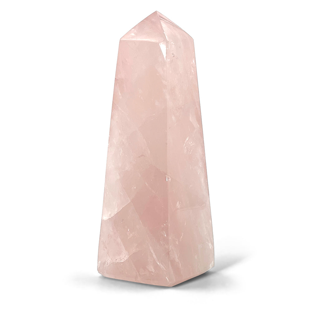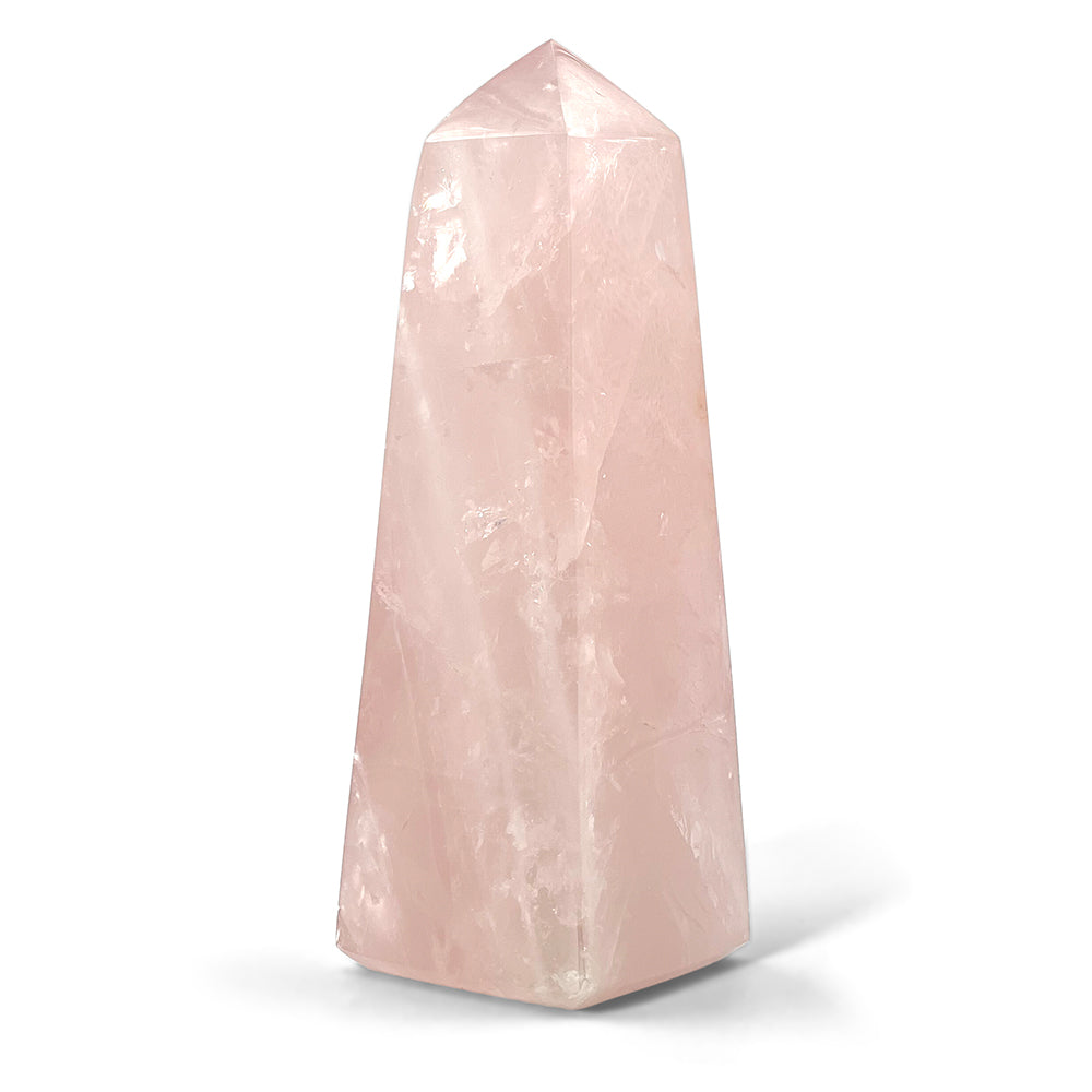 This large Rose Quartz Obelisk carries a decidedly feminine energy with its soft, ethereal pink hues and rainbow inclusions, and yet holds itself in a powerful and striking way.